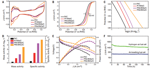 圖2.鉑鎳合金催化性質(zhì)和氫-氧燃料電池性能