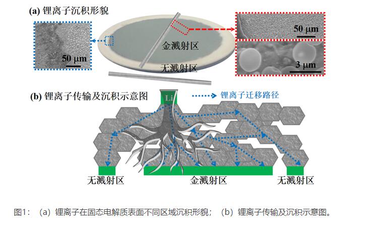 為此,科研人員通過(guò)將電解質(zhì)兩側(cè)金屬鋰電極設(shè)計(jì)成互為垂直結(jié)構(gòu),構(gòu)筑了非對(duì)稱(chēng)結(jié)構(gòu)的固態(tài)電池(圖1a),通過(guò)觀察鋰在電解質(zhì)表面沉積狀態(tài)來(lái)推斷鋰離子在電解質(zhì)內(nèi)部的傳輸過(guò)程。同時(shí),在電解質(zhì)表層中心區(qū)域?yàn)R射Au原子層,通過(guò)與未濺射Au原子層區(qū)域相比較,獲取Au原子層對(duì)鋰離子沉積的影響規(guī)律。研究結(jié)果表明,電解質(zhì)表層的電子分布狀態(tài)會(huì)直接影響電解質(zhì)內(nèi)鋰離子的傳輸路徑(圖1b),使得來(lái)自電解質(zhì)上表層的鋰離子在電解質(zhì)內(nèi)呈發(fā)散狀傳輸。進(jìn)一步分析發(fā)現(xiàn),在未濺射Au濺射區(qū),鋰離子沉積呈現(xiàn)為無(wú)規(guī)則區(qū)域富集分布狀態(tài)(圖1a中藍(lán)框內(nèi)左側(cè)區(qū)域),將誘導(dǎo)鋰枝晶生長(zhǎng)進(jìn)而誘發(fā)短路現(xiàn)象發(fā)生。而在濺射有Au原子層區(qū)域,鋰離子沉積呈現(xiàn)為均勻球形顆粒分布狀態(tài)(圖1a中紅框區(qū)域及藍(lán)框內(nèi)右側(cè)區(qū)域),有效抑制了由于鋰枝晶的生長(zhǎng)帶來(lái)的鋰離子電池的安全隱患。該工作的開(kāi)展為全固態(tài)電池界面性能優(yōu)化及安全性能提升提供了理論與實(shí)驗(yàn)基礎(chǔ)。
