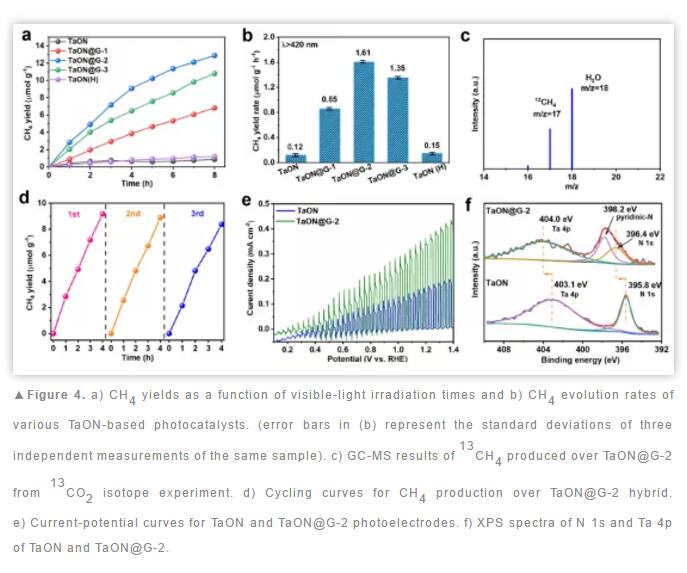 本文通過一種簡(jiǎn)單而新穎的策略設(shè)計(jì)合成了TaON@G分層級(jí)異質(zhì)結(jié)構(gòu),并且其在光催化還原CO2過程中表現(xiàn)出了優(yōu)異的催化活性。這項(xiàng)工作為合理設(shè)計(jì)新型半導(dǎo)體/助催化劑光催化體系提供了借鑒,同時(shí)為研究石墨烯催化機(jī)理和調(diào)節(jié)催化劑的電子性質(zhì)來(lái)實(shí)現(xiàn)高效CO2還原提供了新的理論和實(shí)驗(yàn)支撐。