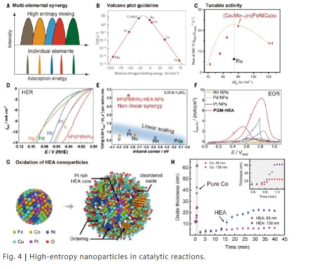 以前高熵合金主要用于結(jié)構(gòu)工程方面的應(yīng)用。約翰霍普金斯大學(xué)王超教授等人首次證明高熵合金納米粒子可以作為熱催化中的高效催化劑。在催化反應(yīng)中,反應(yīng)物或中間體與催化劑表面的結(jié)合既不能太強也不能太弱(Sabatier 原理)以最大限度地提高性能,從而顯示出活性對結(jié)合能的依賴性的“火山圖”。