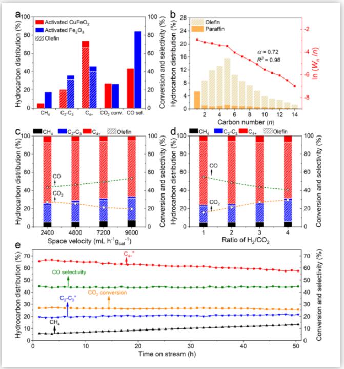 在催化劑合成的時(shí)候,先通過(guò)共沉淀結(jié)合水熱法制備銅鐵礦結(jié)構(gòu)的CuFeO2,然后在氫氣中還原隨后在反應(yīng)氣中預(yù)處理,最終得到了活化后的催化劑,并命名為活化的CuFeO2。對(duì)催化劑進(jìn)行性能評(píng)估發(fā)現(xiàn)在320 oC,1 bar(H2:CO2 = 3:1),空速為2400 mL h-1 gcat-1的反應(yīng)條件下,該催化劑對(duì)C4+=選擇性高達(dá)66.9%,同時(shí)CO2轉(zhuǎn)化率為27.3%,CO選擇性為43.7%。該C4+=選擇性與目前文獻(xiàn)報(bào)道的高壓反應(yīng)條件下的最優(yōu)值基本相當(dāng)。對(duì)比于傳統(tǒng)鐵基催化劑,該催化劑對(duì)CO的選擇性更低,對(duì)C4+=的選擇性更高。為了評(píng)價(jià)催化劑的適用性,我們改變了反應(yīng)空速和H2/CO2的比值,結(jié)果顯示催化劑能夠適用于廣泛的反應(yīng)條件。進(jìn)一步研究活化的CuFeO2的催化穩(wěn)定性時(shí)發(fā)現(xiàn),在反應(yīng)50 h后,CO2轉(zhuǎn)化率基本保持穩(wěn)定,但是長(zhǎng)鏈烯烴的選擇性下降至57.6%,與此同時(shí)甲烷的選擇性逐漸提高到14.6%。這表明催化劑在常壓CO2加氫過(guò)程中會(huì)逐漸失活。