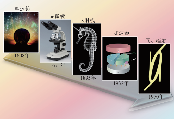 20世紀20年代,加速器的發(fā)明,開啟了人類用高能粒子來研究微觀世界的時代。加速器通過電磁場使帶電粒子加速,其獲得的能量和加速長度成正比。而為了獲得更高能量的粒子,需要不斷增加加速器的長度,由此科學(xué)家發(fā)明了環(huán)形回旋加速器。由于被加速粒子質(zhì)量和能量之間的制約,傳統(tǒng)的回旋加速器無法得到較高能量的粒子。為此,科學(xué)家們進一步研發(fā)出了同步回旋加速器,其磁場強度與粒子能量呈正相關(guān),粒子回旋頻率與高頻加速電場同步,突破了傳統(tǒng)回旋加速器的能量限制,在此基礎(chǔ)上又進一步發(fā)展了同步加速器技術(shù),以實現(xiàn)更高能量的粒子加速。但是高能粒子在閉合的環(huán)形加速器中運動時,當(dāng)運動方向改變時,會在切線方向發(fā)出輻射,造成能量損失。在同步加速器上,第一次實驗觀察到引起加速粒子能量損失的輻射,這種輻射被稱為“同步輻射”(圖1)。