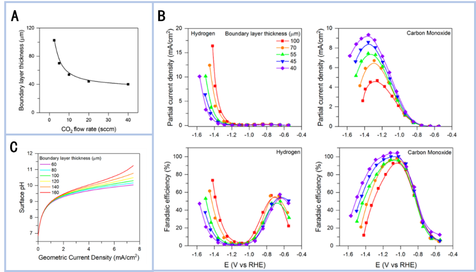 第二,大力混合電解液,減小傳質(zhì)效應(yīng)對(duì)催化劑本征活性的影響??紤]碳酸氫鹽溶液是弱緩沖液,且CO2在水溶液的傳質(zhì)系數(shù)很低,故電化學(xué)還原過(guò)程中電極極化后容易誘導(dǎo)濃度梯度。關(guān)于電解池中的傳質(zhì)邊界層厚度可以通過(guò)測(cè)量鐵氰化物(電化學(xué)可逆性)還原的擴(kuò)散限制電流結(jié)合菲克定律計(jì)算來(lái)量化。如圖1(A)所示,增加CO2流量會(huì)減小流體動(dòng)力邊界層厚度,但隨著CO2流量的增加,其影響會(huì)減小,此時(shí)活性為施加電位的函數(shù)。圖1(B)中,在一定電位下,隨邊界層厚度的減小,H2產(chǎn)量減少而CO增多,在-1.4 V vs RHE ,CO的法拉第效率波動(dòng)高達(dá)約60%。同時(shí),與平面催化劑相比,具有高比表面積的催化劑更容易受到傳質(zhì)限制,進(jìn)而影響其表面pH,如圖1(C),當(dāng)比較不同粗糙度催化劑受到濃度極化影響時(shí),誤差會(huì)變得顯著。