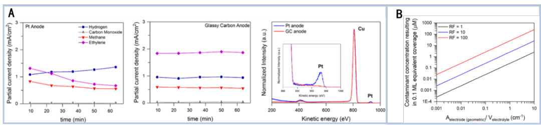 圖2.(A) 在Cu(100)面上鉑陽(yáng)極、玻碳陽(yáng)極活性-時(shí)間關(guān)系(-1.0 V vs RHE),兩種陽(yáng)極獲得的LEIS光譜;(B) 根據(jù)幾何陰極表面積與電解液體積的比率以及陰極表面的粗糙度系數(shù),計(jì)算出覆蓋電催化劑表面10%所需的電解液雜質(zhì)濃度.