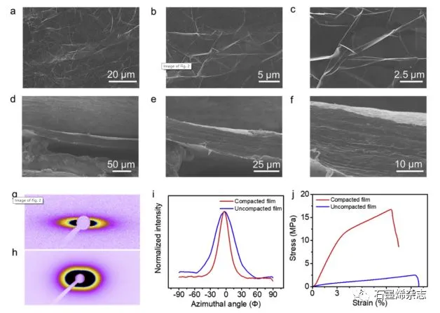 Figure 2. (a-c)石墨烯膜的表面形貌,(d-f)石墨烯膜的斷面形貌,(g)連續(xù)輥壓的電熱處理石墨烯膜的SAXS圖案,(h)未輥壓的石墨烯膜的SAXS圖案,(i)對(duì)應(yīng)的SAXS方位角積分曲線,(j)石墨烯膜的力學(xué)性能。