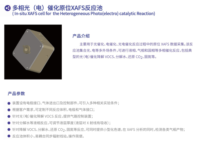 多相光(電)催化原位XAFS反應(yīng)池主要用于光催化、電催化、光電催化反應(yīng)過程中的原位 XAFS數(shù)據(jù)采集。該反應(yīng)池集合光、電等多外場條件,可進(jìn)行液相、氣相和固相等多相催化反應(yīng),包括典型的光(電 )催化降解 VOCS、分解水、還掉 CO2 、固氮等。