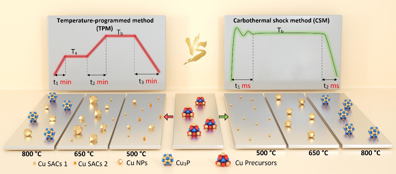 在使用常規(guī)程序升溫法(TPM)熱處理制備催化劑的過(guò)程中,尤其是在高溫制備條件下,由于長(zhǎng)時(shí)間的升溫過(guò)程,銅活性中心在獲得目標(biāo)銅活性中心的過(guò)程中不可避免地經(jīng)歷多個(gè)銅物種的演變,最終形成的活性中心可能是多樣的。這使得在催化反應(yīng)過(guò)程中,如何關(guān)聯(lián)催化劑的結(jié)構(gòu)-活性關(guān)系以及探究催化活性的來(lái)源變得尤為困難。相比之下,如果銅前驅(qū)體能夠在很短的時(shí)間內(nèi)加熱到目標(biāo)溫度進(jìn)行熱處理,那么在此過(guò)程中發(fā)生的銅物種的演化將是最小的或不存在的,這將保證目標(biāo)銅活性物種的均一性。在此,作者采用先進(jìn)的碳熱振蕩法(CSM)使用磷酸銅作為前驅(qū)體合成了系列高度均一的單原子和納米顆粒催化劑,如圖1所示。相比TPM法,CSM法制備的催化劑在相同的熱活化溫度下具有更加均勻和高度分散的活性位點(diǎn)。