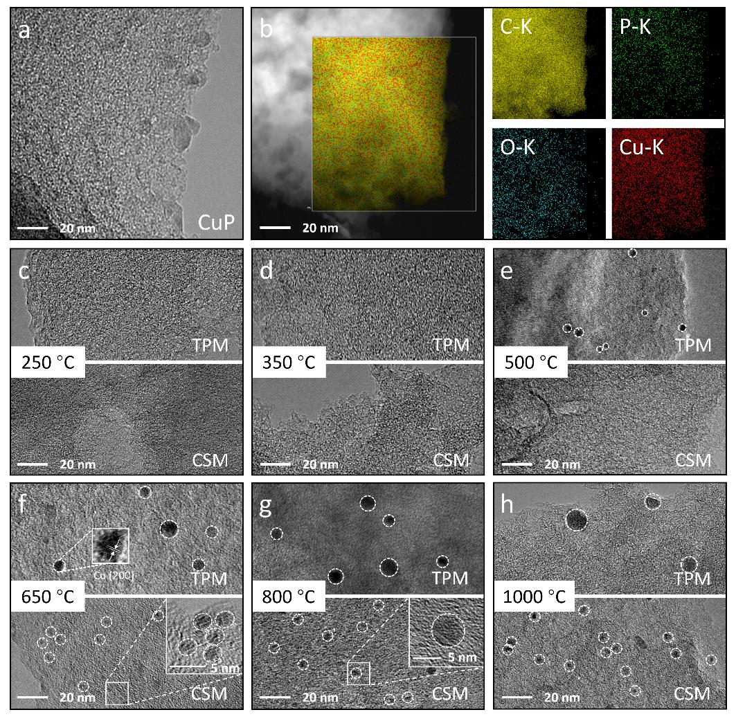圖1 TPM和CSM制備的CuP催化劑的TEM照片。(a) 原始CuP催化劑及其 (b) EDS面分析照片;(c)~(h) 在不同溫度條件下使用TPM (上)和CSM (下)法制備的CuP系列催化劑。