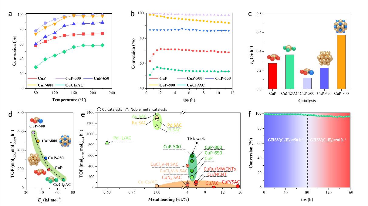納米結(jié)構(gòu)尺寸、配位環(huán)境以及化學(xué)和電子態(tài)效應(yīng)共同調(diào)控碳載銅催化劑在乙炔氫氯化反應(yīng)中的活性、選擇性和穩(wěn)定性。與傳統(tǒng)TPM制備的CuP系列催化劑相比,CSM制備的CuP系列催化劑具有更加分散和單一的活性中心結(jié)構(gòu)。基于CSM,作者從尺寸和價(jià)態(tài)兩個(gè)維度在活性炭上成功構(gòu)建了一系列單活性相銅活性中心。并借助實(shí)驗(yàn)表征和理論計(jì)算,發(fā)現(xiàn)了反應(yīng)物和產(chǎn)物的競(jìng)爭(zhēng)吸附行為影響催化劑活性和穩(wěn)定性的一般規(guī)律,在此基礎(chǔ)上建立了催化劑活性和穩(wěn)定性描述符。這項(xiàng)工作為設(shè)計(jì)高純度的碳負(fù)載金屬催化劑提供了一個(gè)有前途的途徑,通過(guò)構(gòu)建純相活性來(lái)加速對(duì)結(jié)構(gòu)-活性關(guān)系的基本理解。