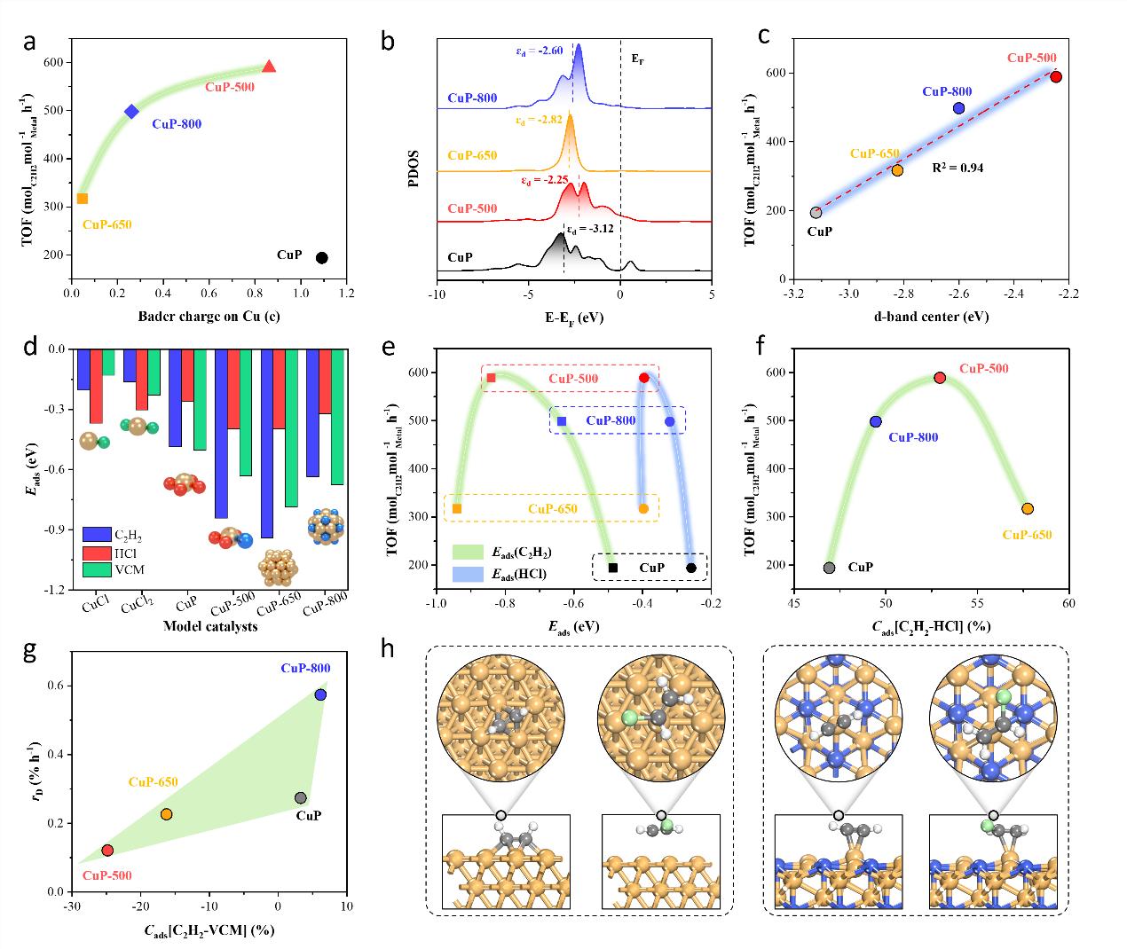最后,對(duì)催化劑CuP-500的反應(yīng)路徑計(jì)算表明(圖6),Cu與O-P位點(diǎn)之間的耦合可以大大提高催化效率,降低反應(yīng)能壘。P - O位點(diǎn)可以誘導(dǎo)HCl極化解離成H和Cl原子,避免了乙炔與HCl一步加成的高能量勢(shì)壘。此外,Cu活性中心在反應(yīng)過(guò)程中的電荷波動(dòng)可以通過(guò)耦合Cu和O-P位點(diǎn)來(lái)消除,從而大大提高了催化劑的穩(wěn)定性。