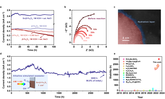 論文中提出了晶格中的Sn增強(qiáng)金屬-氧相互作用的原理,Sn的存在顯著增強(qiáng)了M-O鍵的強(qiáng)度,防止反應(yīng)中間體局部高濃度的質(zhì)子對(duì)晶格的攻擊,提高了晶體結(jié)構(gòu)的穩(wěn)定性。制備的Sn/β-Fe2O3光陽極在長(zhǎng)時(shí)間反應(yīng)后僅在淺層表面檢測(cè)到重構(gòu)的發(fā)生和Cl?的吸附。在模擬海水電解液中工作3000小時(shí)后,光電流仍然保持在初始值的96.8%,是目前世界上穩(wěn)定性最高的光陽極材料。此外,該工作對(duì)材料在海水中腐蝕機(jī)理的探究,以及在防腐蝕領(lǐng)域的探索也具有重要意義。