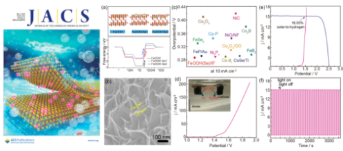 因與析氧反應(yīng)中間物種合適的吸脫附能力,鎳和鈷通常是高性能OER催化劑必不可少的組分。雖然鐵元素遠(yuǎn)比鎳與鈷儲(chǔ)量豐富,價(jià)格低廉得多,但目前鐵基催化劑析氧性能遠(yuǎn)低于鎳與鈷基材料。研究人員首先借助理論計(jì)算揭示非金屬Se摻雜可以顯著改善全鐵基FeOOH催化劑的電化學(xué)析氧決速步驟?;诖耍l(fā)展了一種簡(jiǎn)便的原位電化學(xué)活化策略,通過(guò)在OER條件下將三維導(dǎo)電低成本泡沫鐵基底上原位生長(zhǎng)的FeSe垂直納米片陣列原位電化學(xué)活化轉(zhuǎn)化為Se摻雜的FeOOH納米片陣列,使該全鐵基催化劑同時(shí)具有高本征活性位點(diǎn)和高的電化學(xué)活性面積,因此表現(xiàn)出與全鎳或全鈷催化劑性能相當(dāng)?shù)?/span>OER電催化活性。該策略同樣適用于少量鎳摻雜的富鐵催化劑的制備,使少量鎳(3.3 at%)摻雜的富鐵催化劑可以實(shí)現(xiàn)與最佳富鎳或富鈷催化劑相媲美的電催化OER性能。在電流密度500 mA cm-2時(shí)的過(guò)電位僅需348 mV,并具有優(yōu)異的穩(wěn)定性。將該催化劑作應(yīng)用于電解水裝置,電流密度50 mA cm-2時(shí)的槽壓僅需1.62V。在實(shí)際太陽(yáng)光驅(qū)動(dòng)的水分解系統(tǒng)中,所述催化劑實(shí)現(xiàn)了18.55%的太陽(yáng)光到氫氣的最高轉(zhuǎn)換效率之一。這些結(jié)果表明所述策略為開(kāi)發(fā)新的儲(chǔ)量豐富、經(jīng)濟(jì)、高效的電解水電催化劑提供了一種可能的途徑 J. Am. Chem. Soc., 2019, 141, 7005 。