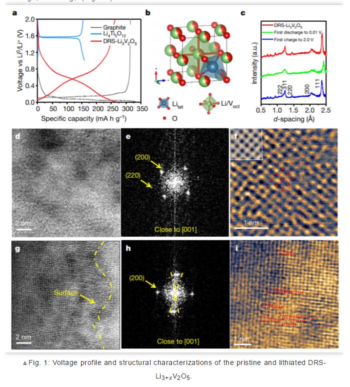 雖然無(wú)序巖鹽結(jié)構(gòu)的氧化物的形成之前已有文獻(xiàn)報(bào)道,但是在此之前沒(méi)有關(guān)于這一類(lèi)電極材料嵌鋰用作負(fù)極材料的報(bào)道。作者通過(guò)恒流充放電發(fā)現(xiàn)無(wú)序巖鹽結(jié)構(gòu)氧化物L(fēng)i3V2O5 的比容量為266 mAh/g(100 mA/g)(Fig. 1a)。