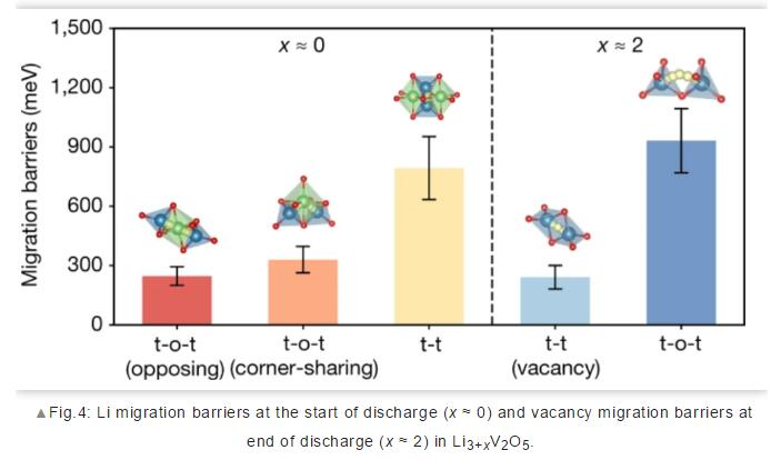 為了研究Li3+xV2O5的快充機(jī)理,作者通過(guò)NEB計(jì)算研究了Li3V2O5和Li5V2O5不同鋰離子傳輸路徑的擴(kuò)散勢(shì)壘 (Fig. 4)。在Li3V2O5中,鋰離子傳輸是由【四面體位-共面八面體位-共面四面體位】(t-o-t)的協(xié)同躍遷所達(dá)成的。當(dāng)兩個(gè)額外的鋰離子嵌入結(jié)構(gòu)后(Li5V2O5),鋰離子重新分布導(dǎo)致八面體位置中的Li/V占有率從100%降為50%(40% V,10% Li)。這時(shí)鋰離子最優(yōu)傳輸路徑從t-o-t的協(xié)同躍遷轉(zhuǎn)變成【四面體位-四面體位】的直接躍遷。這一機(jī)理闡明了Li3+xV2O5快速鋰離子傳導(dǎo)的原因。