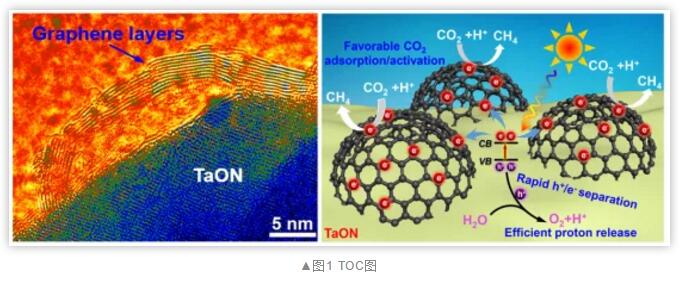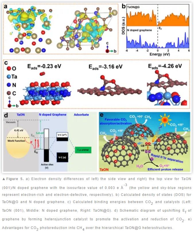 利用太陽(yáng)能將CO2轉(zhuǎn)化成高附加值的碳?xì)淙剂?,是緩解能源危機(jī)并減輕溫室效應(yīng)的有效方法。發(fā)展高性能光催化劑是光催化還原CO2技術(shù)走向?qū)嵱没幕厩疤帷P滦脱醯锱c對(duì)應(yīng)氧化物相比具有更寬的光譜響應(yīng)范圍以及增強(qiáng)的導(dǎo)電性,特別是TaON、Ta3N5、LaTiO2N 由于其較高的載流子遷移速率且導(dǎo)、價(jià)帶能級(jí)滿足還原CO2 和氧化H2O 的熱力學(xué)要求,近年來(lái)廣泛應(yīng)用于光催化領(lǐng)域的研究。對(duì)于半導(dǎo)體基光催化, 擔(dān)載合適的助催化劑構(gòu)筑半導(dǎo)體/助催化劑結(jié)構(gòu),不僅可以為CO2 還原提供額外的活性位點(diǎn)并克服 CO2 還原反應(yīng)的熱力學(xué)障礙,而且由于能級(jí)匹配理論上還可以與半導(dǎo)體復(fù)合形成異質(zhì)結(jié),有助于光生載流子分離,從而大大提高半導(dǎo)體光催化劑的催化反應(yīng)活性。石墨烯由于其較強(qiáng)的 π-π 共軛作用,擁有出色的 CO2 吸附能力,尤其是氮摻雜石墨烯等,由于氮原子的高電荷和自旋密度,氮原子可以作為吸附中心錨定并活化 CO2 分子,甚至直接參與催化反應(yīng),引入石墨烯作為助催化劑為調(diào)優(yōu)光催化 CO2 還原開辟了新的機(jī)遇。然而,大多數(shù)目標(biāo)半導(dǎo)體表面通常具有不規(guī)則的結(jié)構(gòu),因此,如何在高曲率半導(dǎo)體表面均勻可控負(fù)載石墨烯助催化劑并形成緊密粘附異質(zhì)界面存在較大的挑戰(zhàn)。作者基于化學(xué)氣相沉積法在TaON顆粒表面實(shí)現(xiàn)了原位生長(zhǎng)島狀空心氮摻雜石墨烯。所構(gòu)造的TaON@G光催化劑具有利于電荷分離和轉(zhuǎn)移的異質(zhì)結(jié)界面,利于CO2吸附和活化的中空納米島狀石墨烯,以及利于誘導(dǎo)氧化還原半反應(yīng)空間分離的分層次結(jié)構(gòu)。理論計(jì)算發(fā)現(xiàn),高功函石墨烯作為強(qiáng)電子受體與n型半導(dǎo)體TaON耦合能快速抽取TaON中的電子,使得石墨烯表面的局部電子密度增加,費(fèi)米能級(jí)提升。通常電子向CO2 反鍵軌道高效注入被認(rèn)為是CO2 活化的關(guān)鍵步驟,催化劑表面呈現(xiàn)電子富集態(tài)是 CO2 分子活化的重要過程。在 TaON@G 催化CO2 還原過程中,大量的光生電子被富集在島狀石墨烯表面大大增強(qiáng)了石墨烯與CO2之間的相互作用,從而弱化了 CO2中的C=O鍵,使其活化能壘降低,從而加速了 CO2 還原反應(yīng)動(dòng)力學(xué)。 最優(yōu)的 TaON@G 催化劑在CO2-H2O氣-固體系中表現(xiàn)出優(yōu)異的光催化 CO2 全還原活性,其 CO2 至 CH4 的產(chǎn)率超過大多數(shù)目前報(bào)道的 Ta 基 (氧) 氮化合物。