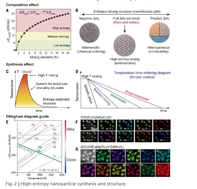 從熱力學(xué)的角度來看,高熵納米顆粒的形成是焓和熵競爭的結(jié)果(ΔG=ΔH-T?ΔS)。高熵納米顆粒的構(gòu)型熵隨著元素數(shù)量的增加而增加,并作為單相混合的驅(qū)動力(圖2A)。多元素相互作用的焓(ΔHij)在很大程度上取決于組成元素的性質(zhì),這直接影響近平衡條件下的所得相(圖2B)。具有廣泛組成范圍和多元素數(shù)(多達8個)的高熵合金 (HEA) 納米粒子的合成是通過由馬里蘭大學(xué)胡良兵教授發(fā)明的高溫“熱沖擊”工藝實現(xiàn)的(圖2C)。這種合成方法的冷卻速率是一個重要參數(shù),因為它影響組成元素可以實現(xiàn)的非平衡程度和結(jié)構(gòu)有序性(圖2D)。通過說明組成元素的氧化電位隨溫度的變化,Ellingham 圖可用于指導(dǎo)高熵納米粒子的熱化學(xué)合成(圖2E)。一般而言,靠近Ellingham圖頂部的元素,如貴金屬和Fe、Co、Cu,氧化電位較?。锤菀妆贿€原),可以通過高溫合成形成合金納米顆粒,如八元 PtPdFeCoNiAuCuSn 的 HEA 納米顆粒(圖2F)。相比之下,靠近圖表底部的元素,如 Zr、Ti、Hf 和 Nb,具有較大的氧化電位,可以形成高熵氧化物納米顆粒,如 (ZrCeHfCaMgTiLaYGdMn)Ox(圖2G)。
