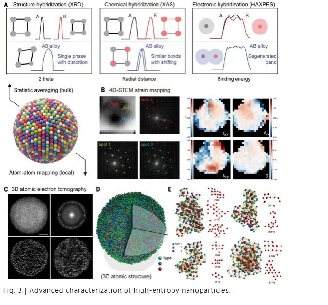 高熵納米粒子應(yīng)顯示單相結(jié)構(gòu),表明組成元素的均勻和隨機混合。然而,這種多元素的隨機混合及其協(xié)同作用的表征非常具有挑戰(zhàn)性。常規(guī)表征技術(shù),如X射線衍射、掃描和透射電子顯微鏡以及 X 射線光電子能譜(XPS),可以幫助確定基本相結(jié)構(gòu) 、形態(tài)、元素分布和價態(tài),但可能缺乏解耦多元素混合所需的分辨率。基于同步加速器X射線的技術(shù)使用更短的波長,可以提供高分辨率以更好地了解高熵納米粒子的原子排列、鍵合和配位以及電子特性(圖3A)。四維掃描透射電子顯微學(xué)(4D-STEM)以及原子電子斷層掃描 (AET)也被用于分析晶格應(yīng)變以及三維原子結(jié)構(gòu)。