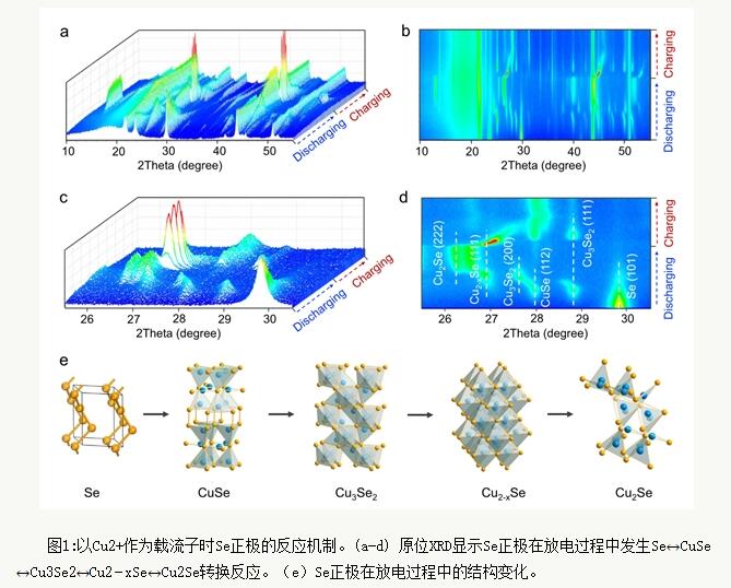 曲良體教授團(tuán)隊(duì)與北京理工大學(xué)張志攀教授、中國(guó)科學(xué)院力學(xué)研究所劉峰副研究員等制備了一系列Se@C正極材料,以Cu2+為正極的載流子,以Cu或者Zn為負(fù)極,組裝電池進(jìn)行電化學(xué)性能測(cè)試。通過(guò)原位XRD、非原位XRD、非原位TEM、非原位XPS等表征技術(shù)研究Se正極在充放電過(guò)程中發(fā)生的變化。通過(guò)恒電流間歇滴定法(GITT)研究了Cu2+在充放電過(guò)程中的擴(kuò)散系數(shù)。