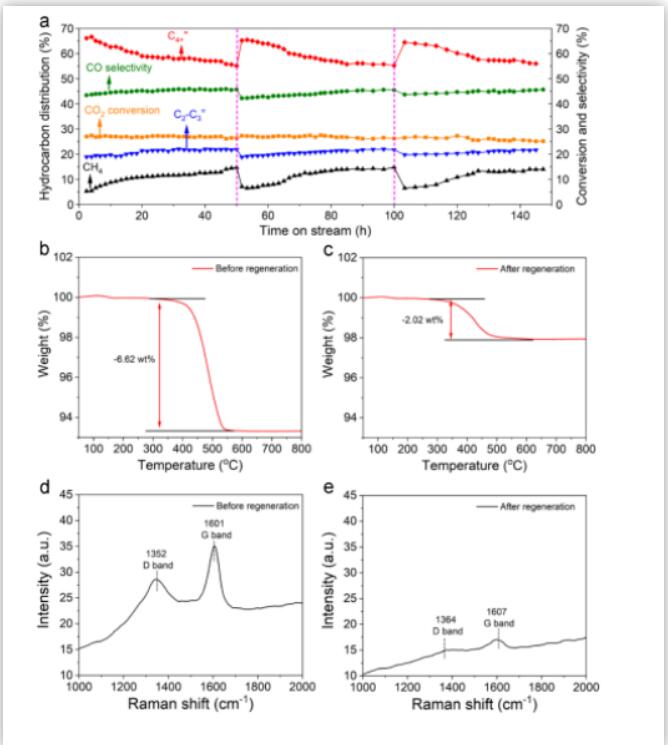 實(shí)驗(yàn)中我們發(fā)現(xiàn)可以通過(guò)簡(jiǎn)單的提高壓力操作讓催化劑再生。即在反應(yīng)進(jìn)行50 h后,將反應(yīng)氣總壓力升至30 bar,并保持4 h,然后再降回1 bar,這時(shí)C4+=選擇性就能夠恢復(fù)至65.2%。我們進(jìn)行了多次再生操作,催化劑每次都能恢復(fù)C4+=的高選擇性。為了探究再生機(jī)制,我們進(jìn)行了熱重和拉曼光譜分析。N2氣氛中的熱重結(jié)果顯示再生前催化劑的失重為6.62 wt%,而再生后催化劑的失重為2.02 wt%。拉曼光譜也顯示再生后的催化劑表面的無(wú)序碳和石墨碳含量遠(yuǎn)低于再生前的催化劑。所以我們認(rèn)為高壓處理祛除了表面烴類和碳物種,使活性位點(diǎn)得以重新暴露從而使催化劑恢復(fù)了活性。并且,通過(guò)元素分析,我們發(fā)現(xiàn)失活的催化劑Cu和Fe分相比較嚴(yán)重,而再生后的催化劑Cu和Fe元素重疊部分更多。