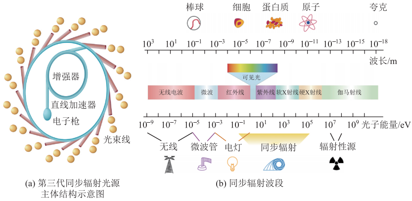 同步輻射是指速度接近光速的帶電粒子在做曲線運動時沿切線方向發(fā)射出的電磁輻射,它的光譜很寬,可以覆蓋從紅外、紫外、軟X射線到硬X射線的光譜范圍,為眾多基礎(chǔ)科學(xué)領(lǐng)域和應(yīng)用研究提供先進手段。從此人類對世界的探索,在空間上拓展到原子與分子尺度,在時間上拓展到納秒、皮秒或飛秒尺度。通過同步輻射光源,我們能夠看到以前難以觀察的物質(zhì)內(nèi)部結(jié)構(gòu)以及變化過程。同步輻射光源是基于同步加速器的裝置,其主要組成部分包括:注入器、儲存環(huán)、光束線、實驗站。同步輻射光源被稱為高品質(zhì)的巨型X射線機和超級顯微鏡,具有高亮度、高準直性以及波長可調(diào)等不可替代的優(yōu)點,是支撐眾多學(xué)科前沿基礎(chǔ)研究與高新技術(shù)研發(fā)不可或缺的實驗平臺(圖2)。