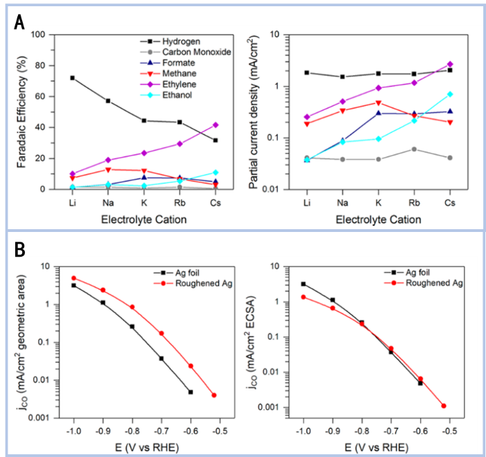 圖3.(A) Cu(100)上產(chǎn)物法拉第效率和部分電流密度對(duì)電解液陽(yáng)離子的函數(shù),-1.0V vs RHE,重碳酸鹽電解液;(B) 機(jī)械拋光和電化學(xué)粗糙的銀催化劑上的活性,左為幾何面積右為電化學(xué)活性表面積(ECSA).