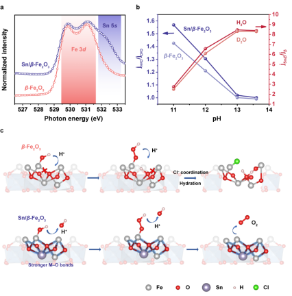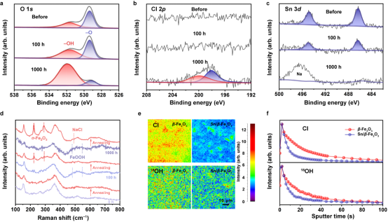 論文中提出了晶格中的Sn增強(qiáng)金屬-氧相互作用的原理,Sn的存在顯著增強(qiáng)了M-O鍵的強(qiáng)度,防止反應(yīng)中間體局部高濃度的質(zhì)子對(duì)晶格的攻擊,提高了晶體結(jié)構(gòu)的穩(wěn)定性。制備的Sn/β-Fe2O3光陽極在長(zhǎng)時(shí)間反應(yīng)后僅在淺層表面檢測(cè)到重構(gòu)的發(fā)生和Cl?的吸附。在模擬海水電解液中工作3000小時(shí)后,光電流仍然保持在初始值的96.8%,是目前世界上穩(wěn)定性最高的光陽極材料。此外,該工作對(duì)材料在海水中腐蝕機(jī)理的探究,以及在防腐蝕領(lǐng)域的探索也具有重要意義。